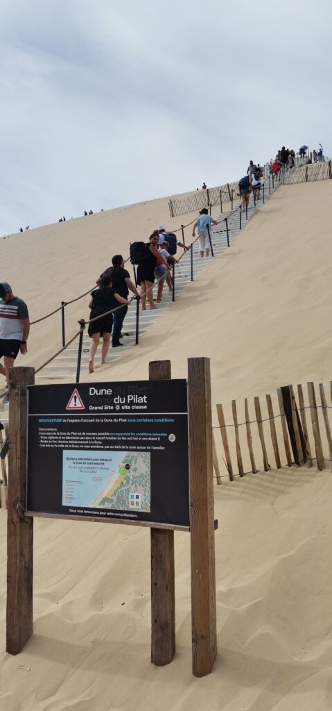 L’accès à la dune est libre, mais deux options s’offrent aux visiteurs : grimper à même le sable, pour les plus sportifs, ou emprunter l’escalier en bois installé pour faciliter l’ascension.