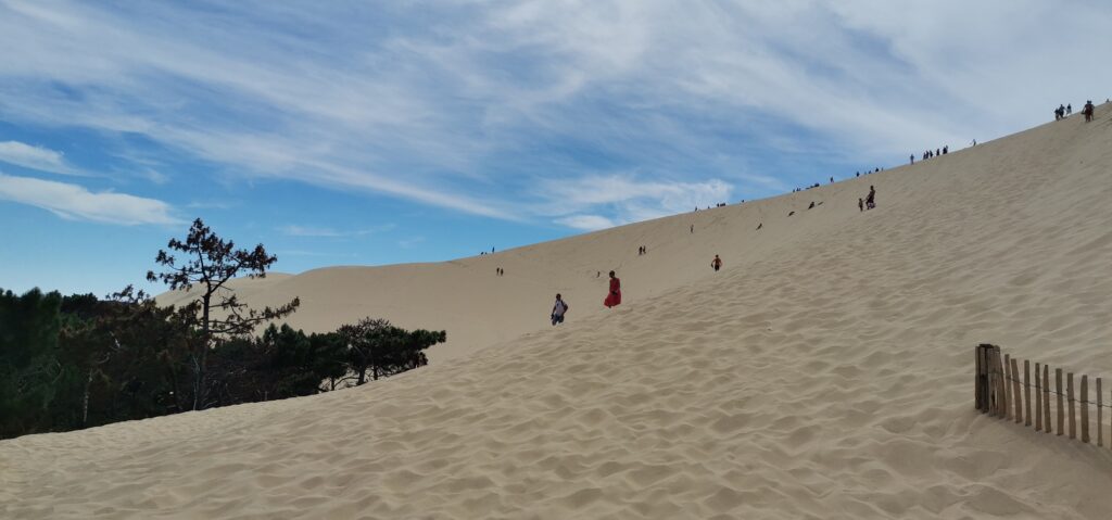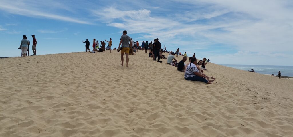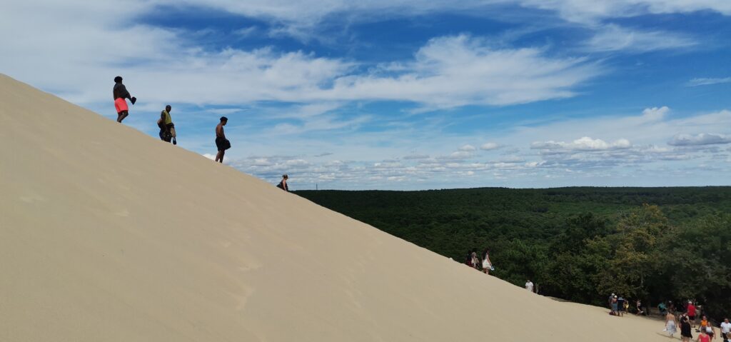 Nous avons choisi les marches. En une quinzaine de minutes, la montée se fait au rythme de l’émerveillement. À chaque palier, la Dune se révèle un peu plus, jusqu’à ce que le regard embrasse une mer de sable doré qui semble se perdre à l’infini. Là-haut, le mot qui revient sur toutes les lèvres : waouh.