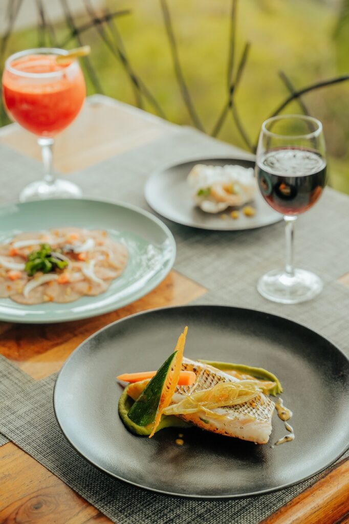 En plat principal, les convives pourront choisir entre un fi let de boeuf, purée de cassava épicée, légumes glacés et jus de vin rouge infusé au cacao des Terres des Sept Couleurs, ou une « Vieille grise » en fi let, purée de petits pois, fenouil confi t, beurre blanc au fruit de la passion et gingembre.