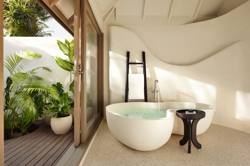 Les voyageurs se réveillent face à une vue panoramique sur la plage, depuis un lit à baldaquin inspiré des dhonis maldiviens traditionnels, encadré par des portes vitrées aux tons ombrés du sol au plafond. Peint dans des nuances apaisantes du même bleu sarcelle, le dressing comprend une coiffeuse îlot inspirée du corail, avec deux vasques et des espaces de rangement ouverts. Des tapisseries brodées de motifs tropicaux et des tringles en forme de branches viennent compléter l’élégance de l’ensemble.