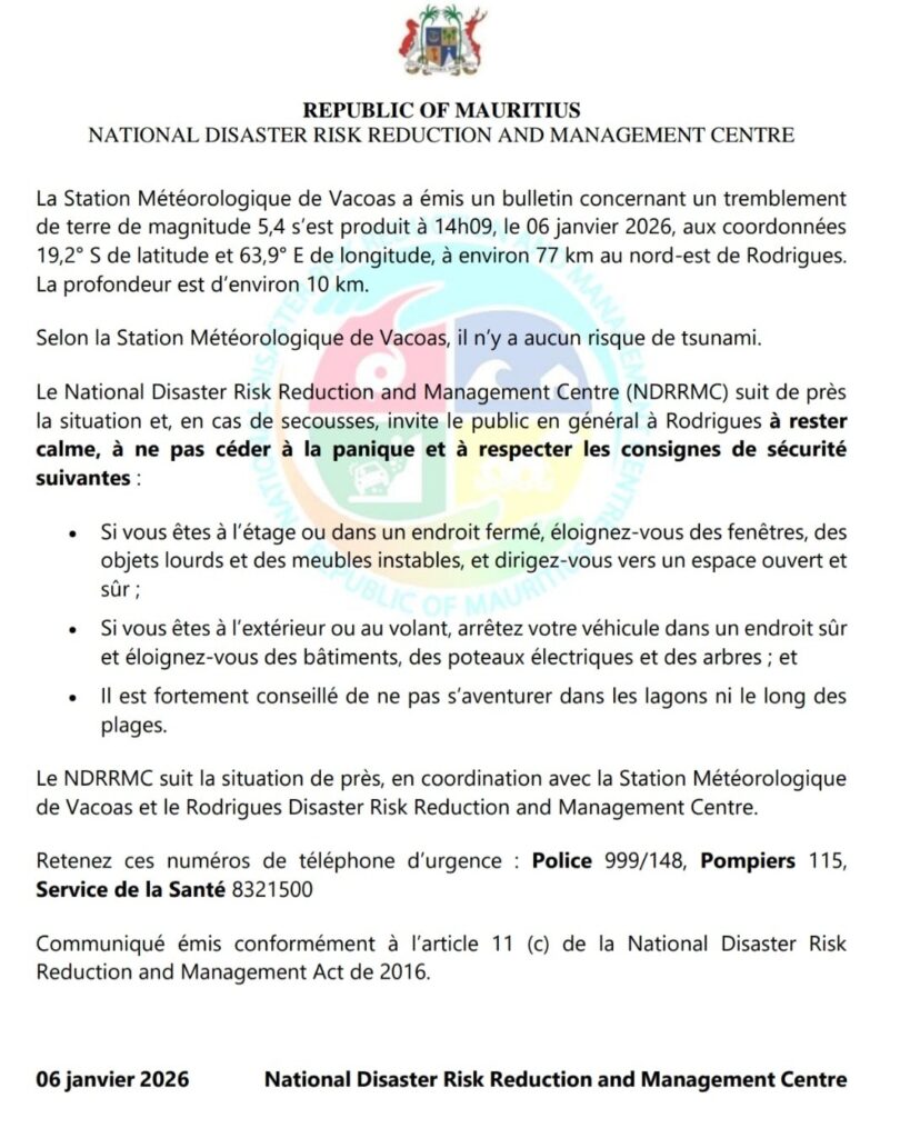 Un séisme de magnitude 5,4 a été ressenti hier à 14 h 09 à travers l’île de Rodrigues, provoquant l’évacuation de plusieurs bureaux et la sensation de secousses par de nombreux habitants dans toute l’île. L’épicentre a été localisé à environ 77 km au nord-est de Rodrigues, à une profondeur estimée d’environ 10 km, selon le communiqué officiel du National Disaster Risk Reduction and Management Centre (NDRRMC).