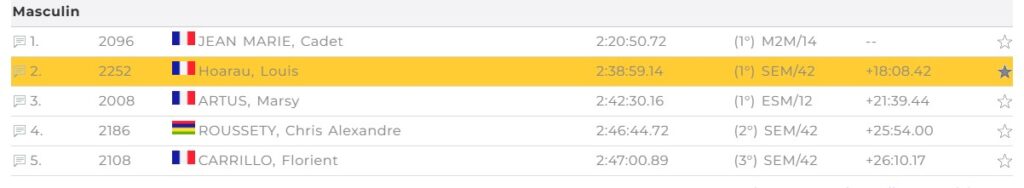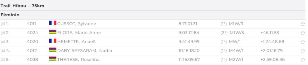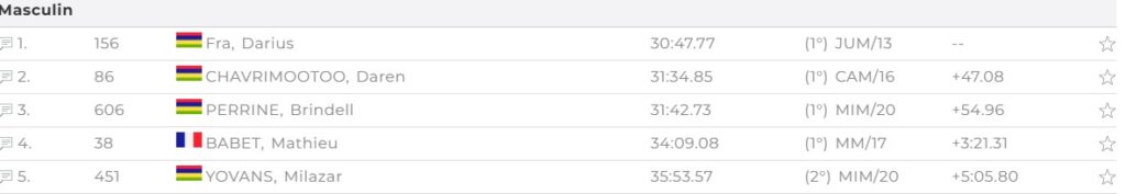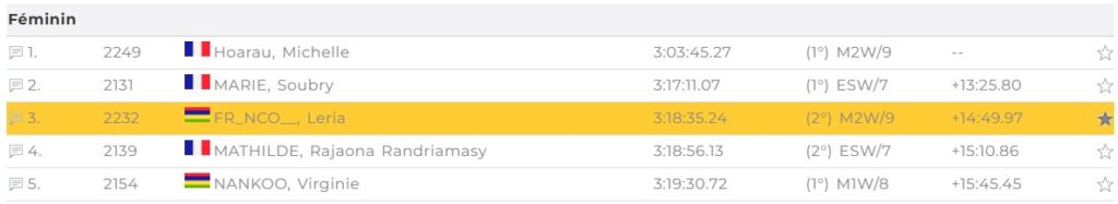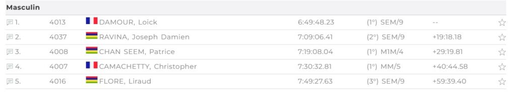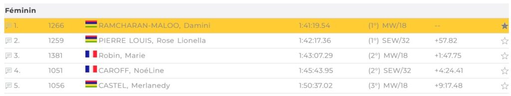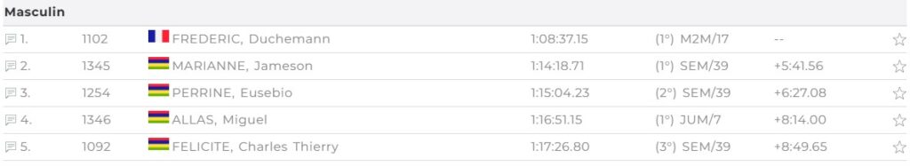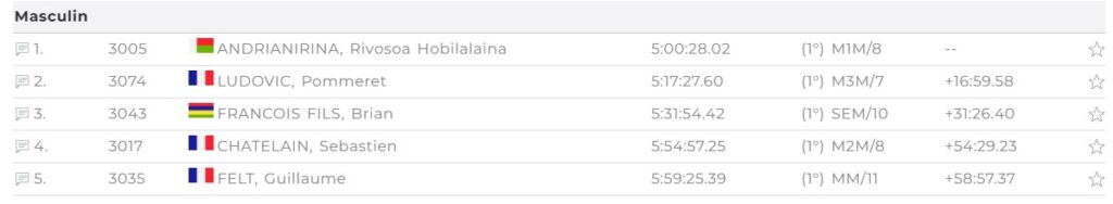 Chez les hommes, Rivosoa Hobilalaina Andrianirina prend la première place, suivi de Ludovic Pommeret et Brian François Fils. En catégorie féminine, Anne Marie John s’impose, devançant Justine Lemaitre et Kaelia Fournier.