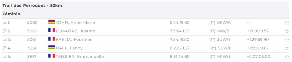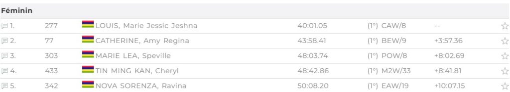 Sur ce parcours plus court mais exigeant, Duchemann Frédéric s’impose chez les hommes, devant Jameson Marianne et Eusebio Perrine. Chez les femmes, Damini Ramcharan-Maloo signe une belle victoire, suivie de Rose Lionella Pierre Louis et Marie Robin.