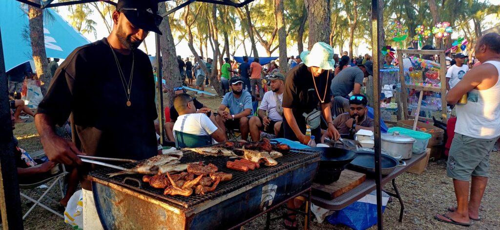 Juste derrière cette atmosphère de compétition, la plage vivait au rythme d’un grand rassemblement familial. Les Rodriguais profitaient de la journée pour déjeuner ensemble, s’installer à l’ombre des filaos ou au bord de l’eau, tandis que les stands de street-food tournaient à plein régime. Grillades de poulet, porc, poisson, snacks typiques : les parfums se mêlaient et attiraient un flot continu de visiteurs.