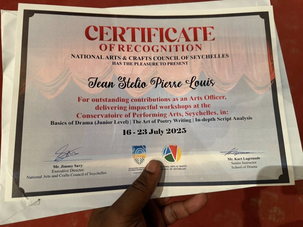 Actuellement en séjour aux Seychelles, Stellio Pierre-Louis a récemment été honoré d’un certificat de reconnaissance du National Arts & Craft Council des Seychelles, remis par son directeur exécutif Jimmy Savy, pour les ateliers de poésie et de théâtre qu’il a animés en juillet dernier au Conservatoire du Performing Arts.