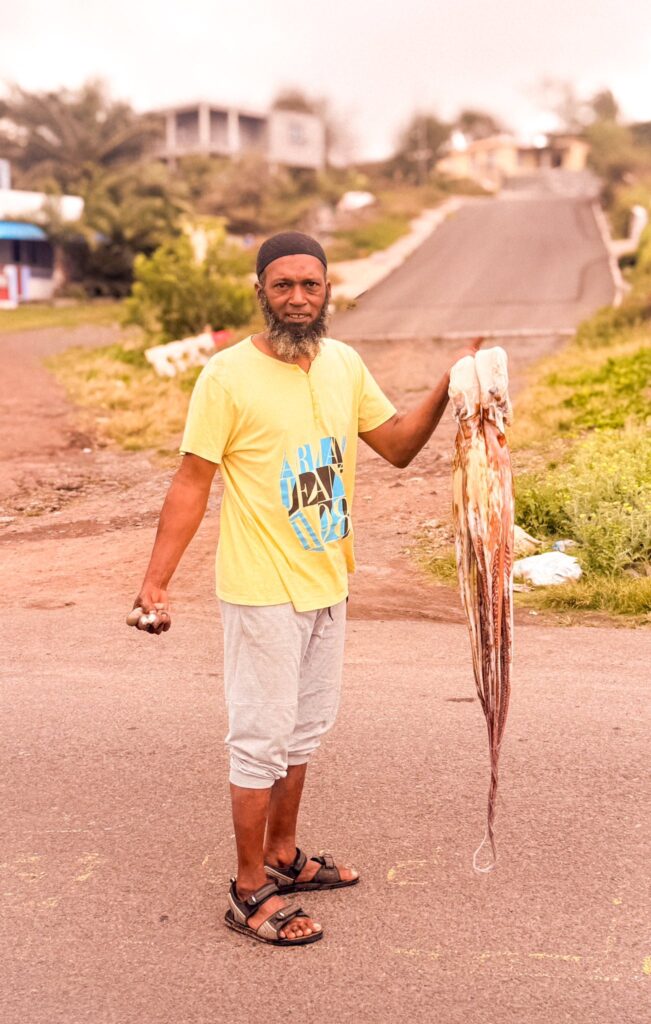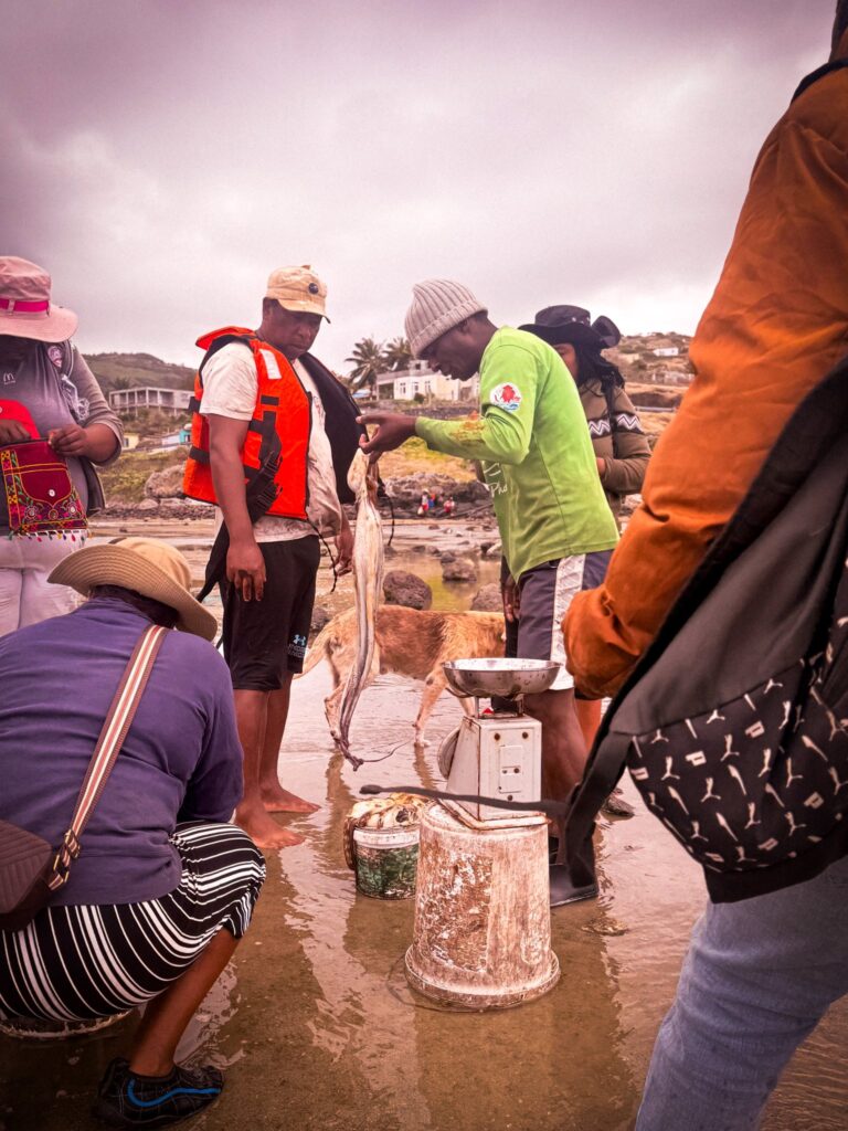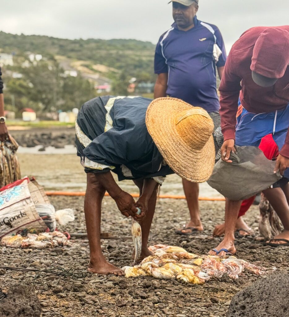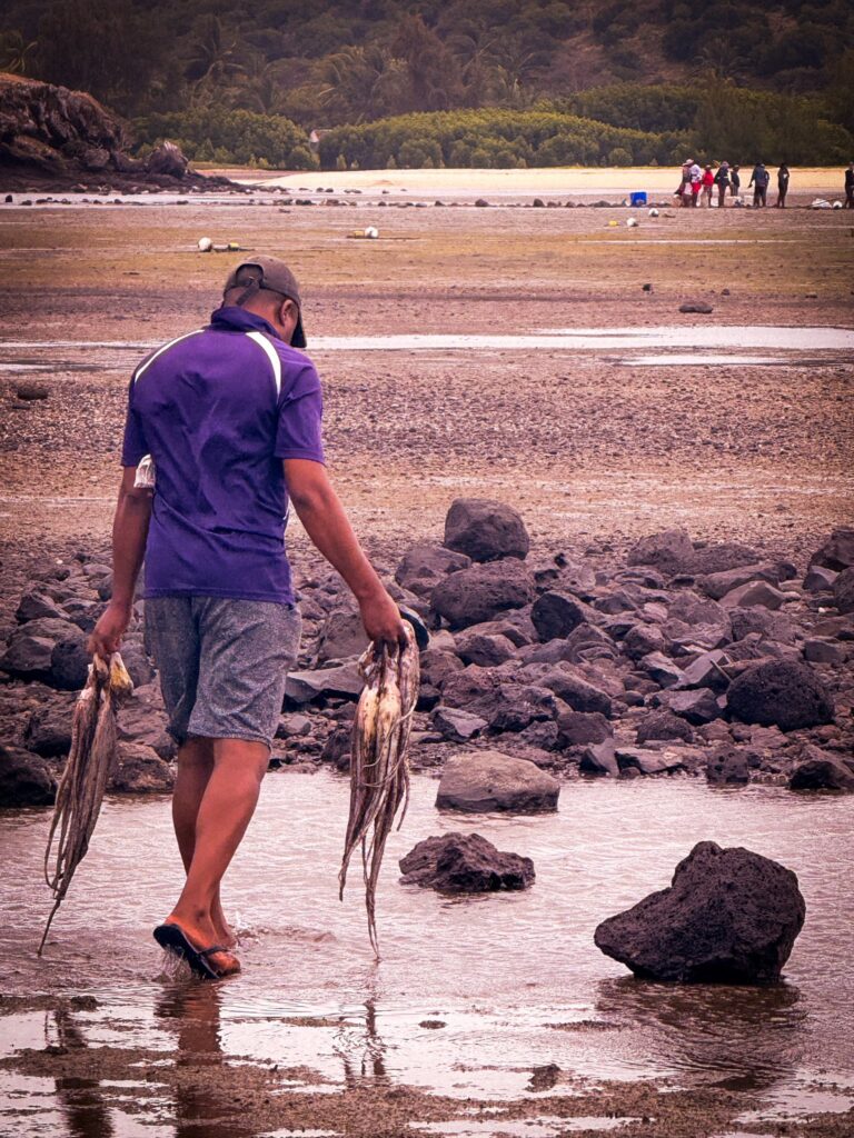 Très vite, les premières prises sont apparues, glissant hors de leur cachette sableuse ou rocheuse. À chaque capture, c’était une petite exclamation de victoire ! Les bayans, acheteurs de gros, attendaient déjà au rivage pour négocier les paniers encore dégoulinants, pendant que des agents comptabilisaient méthodiquement la récolte ; – combien d’ourites, combien de kilos – pour dresser le portrait de cette première journée. Un rituel nécessaire pour suivre l’évolution des stocks, car à Rodrigues, la pêche à l’ourite est strictement encadrée : une fermeture annuelle permet aux poulpes de se reproduire et à l’écosystème marin de se régénérer.